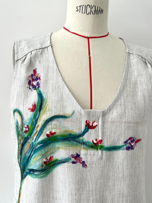 Experience breathable, natural fabrics adorned with hand painted colors, creating timeless pieces that tell a story..